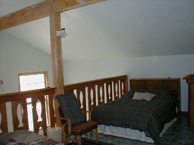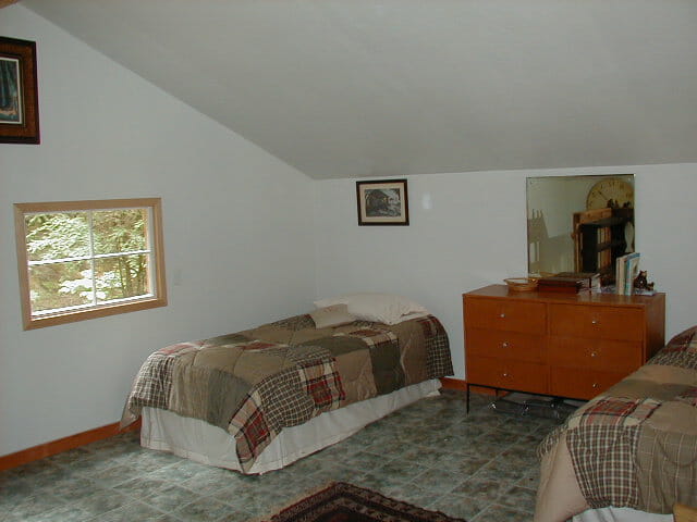 Our largest cabin, it has 9 beds. Upstairs in the loft are 1 double and 2 twins. A separate bedroom has 4 bunk beds and there are two twins in the living area. It has a large kitchen and living area and big deck.
